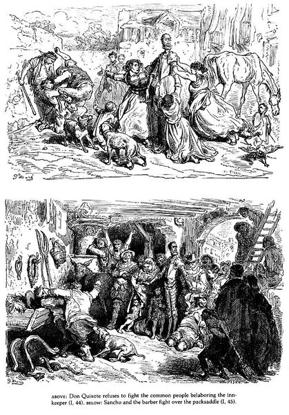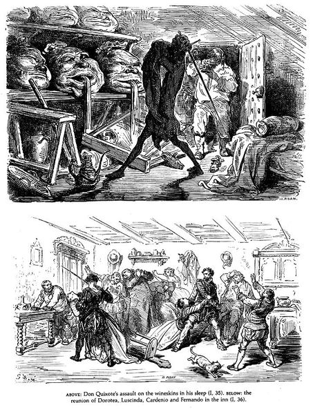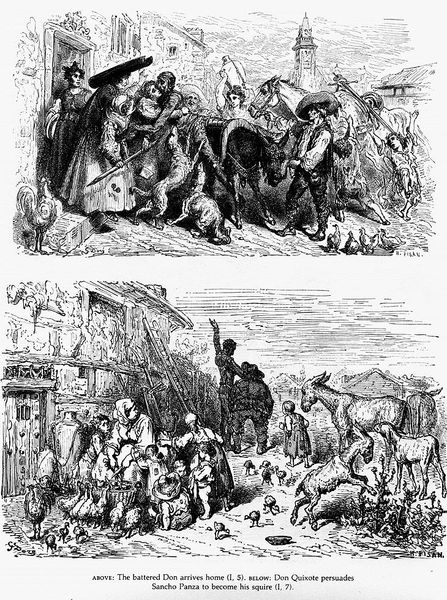 Gustave Doré made this pen and ink illustration of Don Quixote in France, sometime in the mid-19th century. It is a visualization of a key scene in Miguel de Cervantes' 17th-century novel. Doré's image offers us two contrasting scenarios, divided into an upper and lower panel. The upper panel depicts Don Quixote's return home, where he is seen conversing with his family and friends in a composed, domestic setting. A crucifix hangs on the wall, a signal of the normative values of the household. Below, the tone shifts dramatically as the Don’s niece and housekeeper physically prevent Sancho Panza from entering the home. Doré’s image speaks to the social anxieties of 19th-century France, a nation still grappling with the legacy of revolution. The image highlights the social tensions and class divisions inherent in Cervantes' original text, but makes them newly relevant to a contemporary audience, long after the book was written. To understand this image more fully, one might research the history of Cervantes' reception in France, or look into the economic conditions that gave rise to the bohemian artist subculture in which Doré worked.
