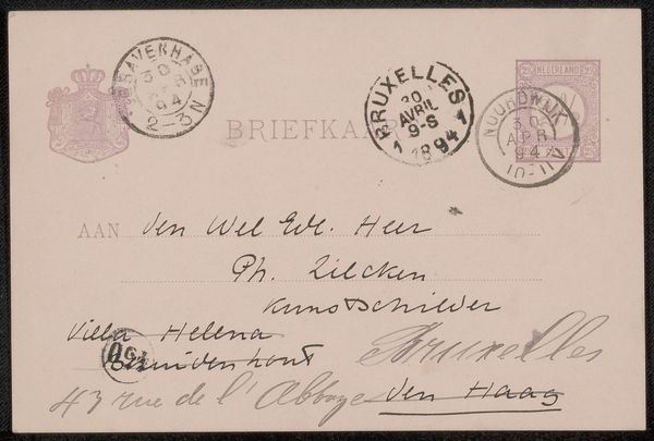 This is a briefkaart, or postcard, to Philip Zilcken, written by Grada Hermina Marius, likely in the Netherlands around the late 19th or early 20th century, judging by the postmark. The existence of this object is a testament to the changing social function of art in this period. The Dutch Golden Age saw an explosion in artistic production but with an emphasis on commissions for wealthy patrons. The later rise of art criticism, of which Marius was an important practitioner, saw a broadening of the audience for art and a related increase in interest in its social function. The existence of cheap, mass-produced objects such as this postcard, which could have featured an image of a painting, allowed for a democratization of art consumption. To understand its significance fully, we'd want to know more about Zilcken and Marius, about the image that may have been on the front of the card and about the institutional shifts that made the circulation of images like this possible. It is through research such as this that we can appreciate the role of art as contingent on social and institutional context.