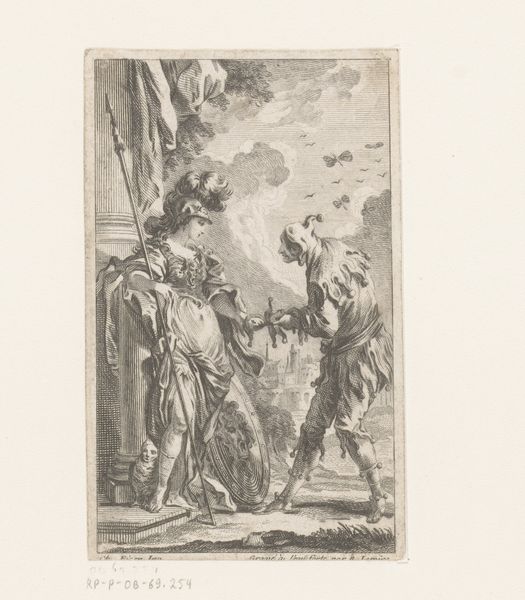 This is Samuel Bottschild’s "Allegorie op de geschiedschrijving", an etching from the late 17th century. Notice how the composition unfolds from left to right, beginning in shadow and culminating in light. Bottschild orchestrates a scene where figures cluster around the act of writing history. Historia sits, adorned with laurel, her gaze fixed beyond the frame, suggesting history's reach into the future. Look at how the textures vary—the smoothness of her gown contrasts with the rough etchings that define the faces of the observing figures. The structure suggests a discourse on history itself—its construction, its observers, and its muses. The allegorical nature of the work invites us to question how narratives are composed and what roles are played by those who record and interpret events. Does Bottschild suggest history is a constructed narrative, a play between fact and interpretation?