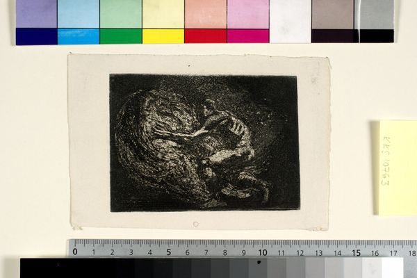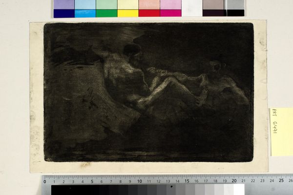 Oluf Hartmann made this small print called 'Two Witches Fighting over a Broomstick' using an etching technique. What immediately strikes you is its monochromatic palette, dominated by deep blacks and subtle grays. The figures emerge from a dense, almost impenetrable darkness, creating a sense of mystery and unease. Hartmann uses stark contrasts to define form, but the lack of clear outlines blurs the boundaries between the figures and their surroundings. This obscuring effect can be linked to the Symbolist movement, which sought to evoke moods and psychological states rather than depicting the external world realistically. The very structure of the image challenges fixed meanings, presenting a world where forms are fluid and meanings are ambiguous. The dynamism in the composition, with the witches contorted in struggle, adds to the dramatic tension. Ultimately, it invites us to contemplate the darker, more irrational aspects of the human psyche, continuing to provoke thought and debate.