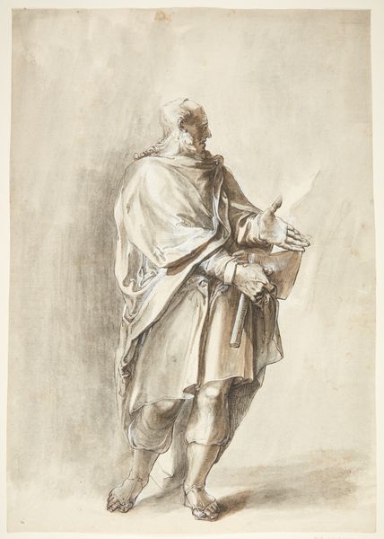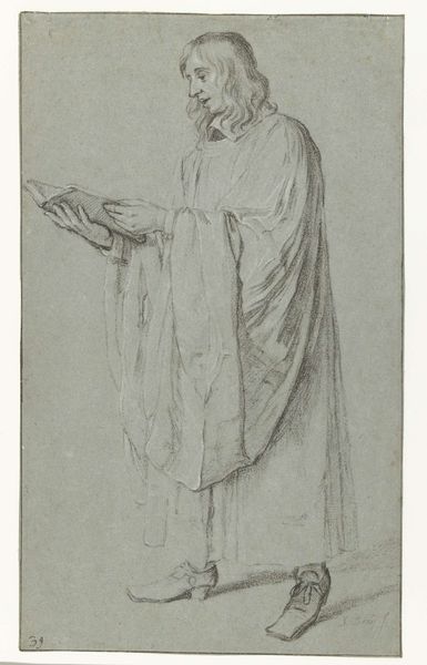 Editor: Here we have Abraham Bloemaert’s “Bishop Kneeling in Prayer,” date unknown, a pen, ink and charcoal drawing. The stark contrasts between light and shadow create a very somber mood. What are your initial thoughts? Curator: It's interesting how Bloemaert uses the image of a kneeling bishop. Considering the period, this imagery served several potential purposes. The church held significant socio-political power, and depicting its representatives in prayer served to reinforce notions of piety and obedience, yet such display can also be seen as a reflection upon the changing religious landscape of the time and power struggles. Do you think this drawing was intended as a straightforward depiction of faith, or might there be a more complex message? Editor: That's fascinating! I hadn't considered the potential socio-political implications. Perhaps there’s some tension between religious devotion and worldly authority depicted? Curator: Precisely. And remember, artistic patronage often came from the Church or related institutions. Even seemingly devotional images were produced within specific power structures. It is not an either/or but the entanglement of both! Bloemaert's artistic skill further elevates this potentially propagandistic image. Notice how he uses light to dramatize the figure, emphasizing the folds of the bishop’s robes? That focus makes him almost a symbol. Editor: Yes, the way the light catches the fabric almost feels theatrical. Now I'm also thinking about how images of religious figures were displayed publicly during that time. Curator: Exactly. These images reinforced societal hierarchies and values, especially in the Baroque period. Reflecting upon them critically now helps reveal the values of the time. How does thinking about that shape your reading of the piece now? Editor: I guess, before, I was simply reacting to the solemnity of it, but now I’m questioning who it was made for, and what role it played beyond being just a devotional image. Thanks! Curator: It shows how understanding historical context allows for deeper readings. Now we know that such devotion also reflects power!
