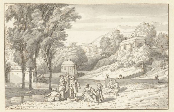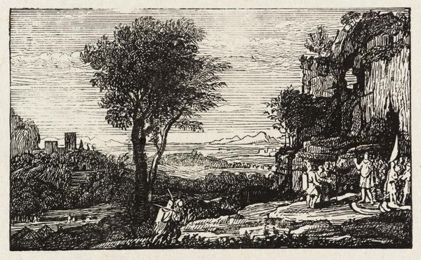 Editor: Nicolas Perelle's "Landschap," dating from around 1680 to 1695, is a beautiful engraving held here at the Rijksmuseum. I'm struck by the detail and the sense of depth he creates. It's so precise, especially given it's a print. How do you read a landscape like this in terms of its historical and social context? Curator: Landscape prints like these in the Baroque period often served multiple purposes beyond pure aesthetics. Consider the context of their distribution: these images helped shape a visual culture, disseminating ideas about nature, property, and even national identity. Ask yourself, what does this idealized landscape *do* for its viewers? Editor: "Do?" You mean besides just being pretty? Curator: Exactly. It's crucial to think about who this image was intended for, how it would have been viewed and circulated, and the kind of social values it reinforces. Does it evoke a sense of order and control over nature, reflecting perhaps the aspirations of a landowning class? Is it contributing to the emerging ideas about national identity and landscape? Editor: So it's not just about pretty scenery, but about power and ownership being communicated? That's fascinating. The figures seem almost incidental, which reinforces the idea of nature being primary, but perhaps only for those who have the privilege to appreciate it? Curator: Precisely. And what's the role of the museum today, in displaying an object that had a life propagating social values? The context and curation adds another layer to its understanding. Does exhibiting this piece now endorse these historic structures, critique them, or perhaps, provide opportunity to create new associations and awareness? Editor: I hadn't considered the museum's role in shaping our view of it. This piece is far more layered than I initially perceived, and there's much more to prints like this. Thanks for shedding a new perspective on how museums, galleries, and sociopolitical forces shape art. Curator: And thank you for making me think more consciously of the politics of displaying the images.