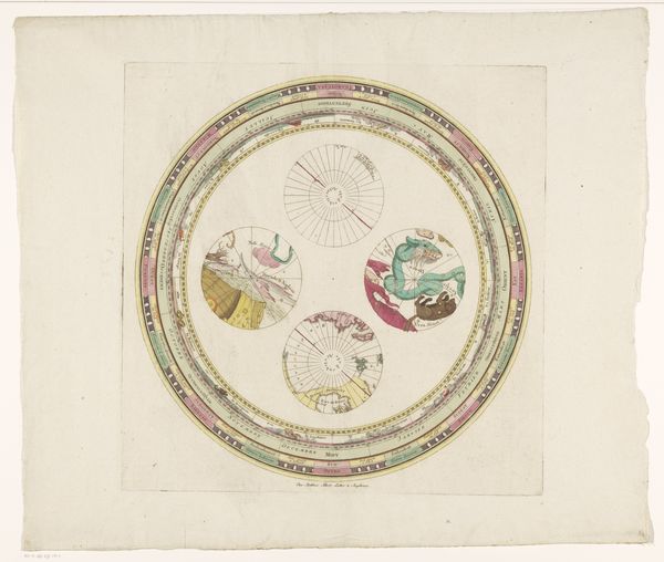 Cornelis Pronk created this design drawing for a plate featuring a lady with a parasol, sometime in the first half of the 18th century. Executed with pen and watercolor, the design presents a circular composition, setting up a clear hierarchy of space. The central scene depicts figures in an idyllic landscape, bordered by decorative bands. A semiotic reading reveals layers of meaning; the outer concentric band is punctuated by cartouches containing symbolic motifs, alternating with floral arrangements, creating rhythm and balance. The central scene disrupts this symmetry with asymmetrical figures that invite the viewer's eye. Pronk uses the circle, not just as a shape, but as a container of cultural narratives. This circular design challenges fixed perspectives, prompting ongoing interpretation of cultural exchange and artistic expression.