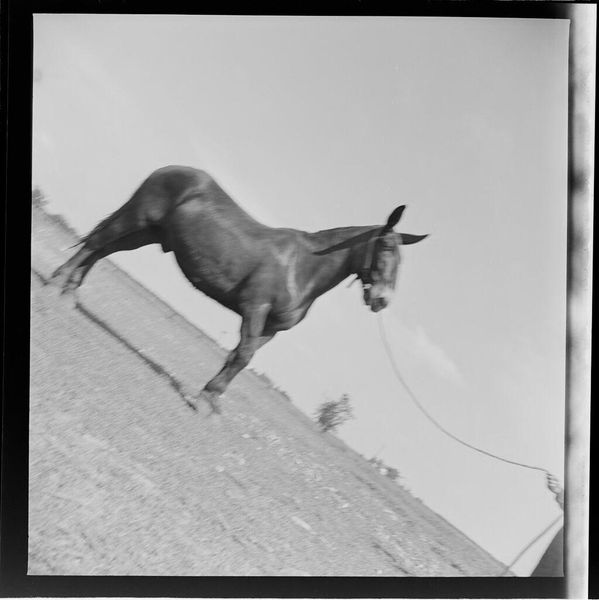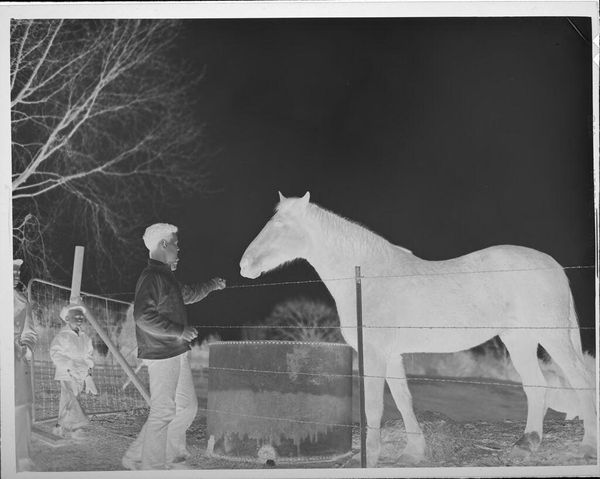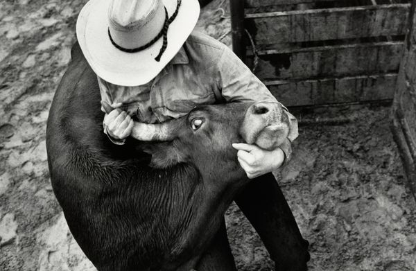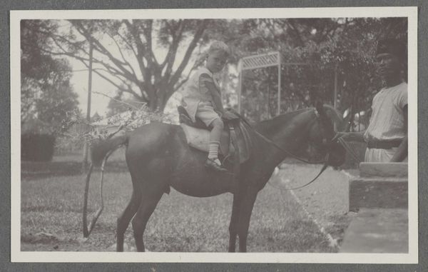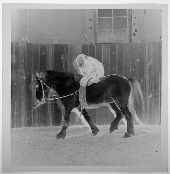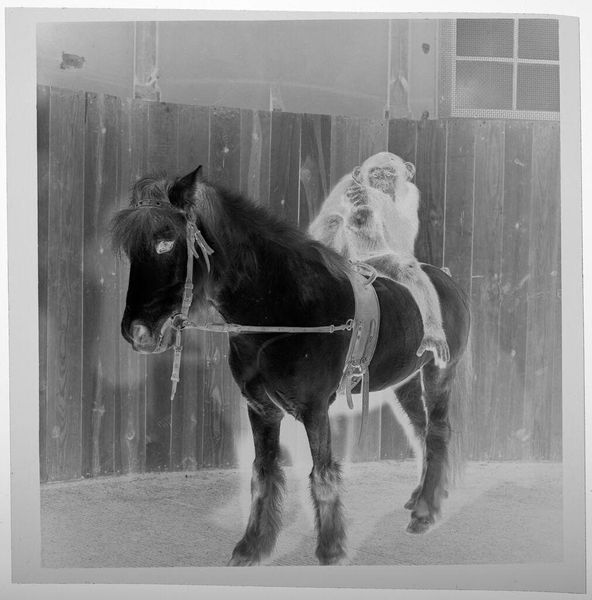 Editor: This black and white photograph by Ken Whitmire Associates pictures a boy on horseback. The composition feels very formal and still. What do you see in this piece? Curator: The stark contrasts and controlled tonal range emphasize the texture of the horse's coat and the boy's attire. Note how the framing isolates the figures against a horizon line, which, in turn, highlights the geometric interplay of the corral's fence. Do you observe how the formal arrangement conveys a sense of constructed identity? Editor: Yes, I see that now. The lack of action also seems to emphasize the geometry and stillness, not a real lived moment, but a staged one. Curator: Precisely. The photograph transcends mere representation, becoming a study of form and the semiotics of portraiture. Editor: I've definitely gained a new perspective on the construction of the image. Thanks!