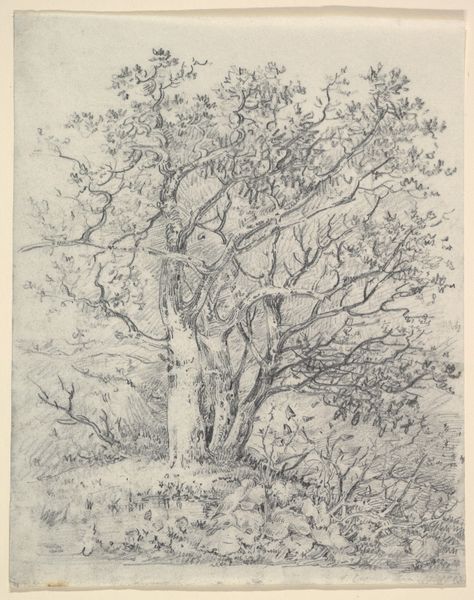 Editor: Here we have "Tree with Undergrowth" by Franz Kobell, likely dating to the late 18th century. It's rendered in pen and ink on paper. There’s an appealing sketch-like quality to it, the details seem built through layered hatching. What strikes you when you look at this drawing? Curator: What’s most apparent is Kobell’s mastery of line. Notice how the density of the hatching defines volume and texture. In the tree's canopy, short, nervous strokes convey the lightness of foliage, while the thicker lines lower down suggest the dense undergrowth. How does the structure of the tree itself strike you? Editor: I see what you mean. The density definitely guides the eye. I am intrigued by the tree’s reaching branches. They fill up space while still allowing light through, which maybe it is intended to give a sense of natural growth, but there's an incompleteness, a raw quality to the execution. Do you think this contributes to the emotional impact? Curator: Precisely. The 'raw quality' you observed is an essential part of its construction. Observe how the linear forms construct a lattice – light and dark are carefully balanced. The structure, as I am interpreting it, explores this contrast as an aesthetic. The placement of the lines makes use of the white space of the paper as a value. It achieves this balance through the careful placement of line to draw out this balance. Do you follow? Editor: Yes, that makes sense. It’s like he’s composing with emptiness as much as with ink. Thinking about it structurally highlights that balance, making it a striking image. Thank you. Curator: Indeed, it exemplifies how a rigorous focus on the formal elements can illuminate a work’s aesthetic power and impact. Thank you for your insight.