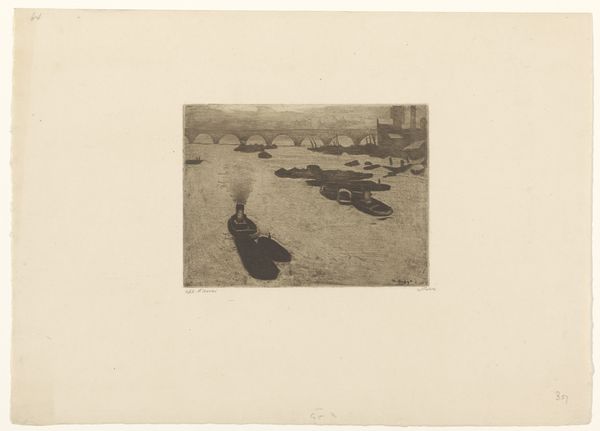 Editor: Here we have a piece called "Zeegezicht met twee zeilschepen," or "Seascape with two sailing ships." It's an etching, dating sometime between 1850 and 1883, by Jerôme Tuyttens. It feels rather bleak to me; the light is dim, the ships are small, and the sea seems turbulent. What stands out to you when you look at it? Curator: Bleak, yes, but beautifully so! It whispers stories of the sea, doesn't it? Imagine the artist standing on the shore, capturing not just the ships but the very soul of the ocean. It feels incredibly honest, unvarnished. What do you notice about the sky, those etched lines? Does it remind you of anything? Editor: The sky almost feels heavier than the sea. There's so much texture there, really dynamic, while the sea is simpler. I suppose it feels realistic in a way, life wasn't always a joyous breeze. Curator: Exactly. And think about the time! The Industrial Revolution booming, artists turning their gaze to everyday life, the raw beauty of nature. There's a quiet rebellion in choosing this scene, don't you think? It is a declaration in ink, claiming worthiness to something often overlooked for more pompous narratives. What stories do those little boats tell? Editor: I hadn’t thought about that. Maybe it's about the smallness of humanity against the power of nature. Or the lives of fishermen, far from grand history. I initially missed that feeling completely. Curator: Isn't that the joy of art, though? Each viewing unveils a new layer. Next time you feel tossed around in life, remember those ships bobbing on the turbulent water – find solace and perspective, you see? We are here, together, sailing! Editor: That's a lovely thought. I’ll definitely look at seascapes differently from now on. Curator: Me too, and now I'll imagine that those sailors are happily lost! Thanks for this intimate sea journey.