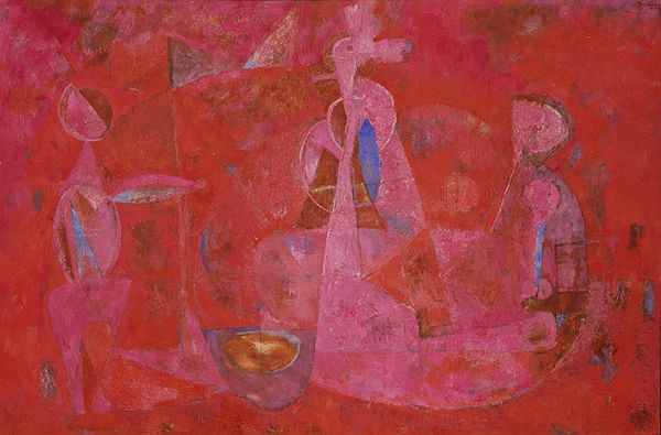 Curator: Leonora Carrington created this striking gouache painting, titled "Operation Wednesday" in 1969. What's your first reaction to it? Editor: Eerily captivating. There's a pallid dreaminess to the colors, almost like a faded photograph, yet the scene itself is so precisely rendered. I am curious about those white figures in the scene. Are they medical staff, perhaps? Curator: They could be. Carrington fled Europe during the Second World War and witnessed institutional violence firsthand. Her time spent in asylums during the period profoundly influenced her work. Note how these spectral figures, with their vaguely medical garb, seem to both attend to and possibly threaten the veiled figure at the center. Editor: The act of veiling feels key here. The use of black in stark contrast to the clinical white creates this sense of both concealing and exposing, which could extend to notions of patient confidentiality but could just as well allude to some more complex interplay of dominance in gender. Then there is that singular eye. Curator: Absolutely, and this work could easily be viewed in light of its political and social contexts: anxieties of the time and also Leonora Carrington's background. "Operation Wednesday," might refer ironically to routines enacted upon marginalized individuals within these total institutions and other sites of social control, reflecting an era ripe with protests and resistance. Editor: Thinking about this picture's making process, using gouache in this way really highlights the luminosity while retaining a certain opaqueness. The method aligns beautifully with the painting's dreamlike and almost hallucinatory atmosphere. Is the format chosen to connect painting to labor? Curator: I don't think so. Carrington never subscribed to standard expectations, either artistically or personally. This painting showcases Carrington’s ongoing critique of institutions through an ethereal technique. Editor: In other words, technique isn’t merely ornamental; the painting technique informs meaning. Thinking through the making illuminates how these paintings act not just as representation, but interventions, that destabilize set historical, and hierarchical assumptions. Curator: Yes. Looking closely and thinking broadly about the artwork reveals the power it has and encourages conversation. Editor: Indeed. And it all begins with that strange composition and how its execution in gouache plays a role in reinforcing it.
