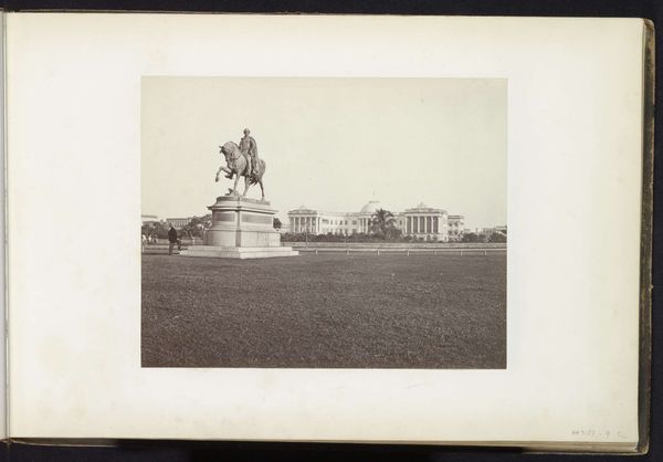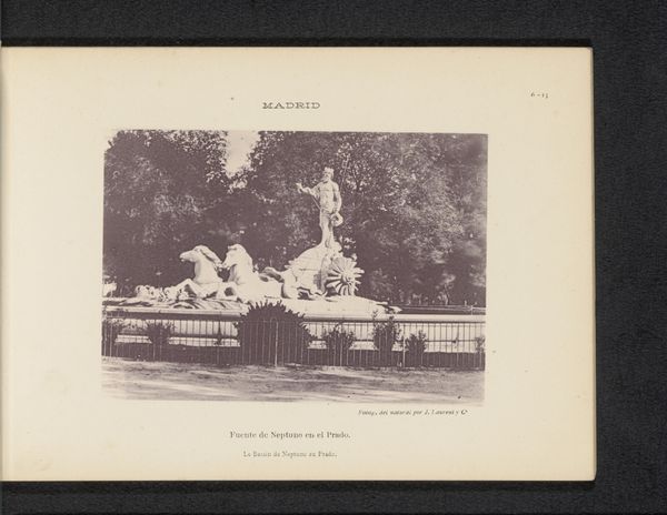 Curator: This photograph captures the Oorlogsmonument, or War Monument, located in the Hofgarten park in Düsseldorf. The photo itself dates back to 1897 and is now part of the Rijksmuseum's collection. Editor: The first thing that strikes me is the sculpture's placid stillness. It is monochromatic, so the subtle interplay of light and shadow across the figures is especially pronounced. It gives a rather peaceful, perhaps even melancholic air to the monument. Curator: Absolutely. Neoclassical monuments often seek to evoke idealized versions of the past, but the image itself, especially in a photograph, can be laden with symbolism. Notice how the draped figure reclines with what seems to be a lion by his side. One has to consider the legacy of German militarism in the light of that imagery. Editor: That draped figure’s posture almost appears to be deliberately echoing classical funerary sculptures, but perhaps a point more to the power dynamic at play. This, coupled with the recumbent lion—the very symbol of dominance. Is this really about mourning, or is it really celebrating something darker? Curator: These symbols resonate across centuries. The lion represents strength and courage, of course. The figure could be an allegorical representation of Germania, perhaps mourning the losses of war while also projecting strength and resilience, ready for times to come. This tension between grief and national pride seems very indicative of late nineteenth-century nationalism. Editor: It’s not simply a memorial for a tragic occurrence in the past. If the intent were primarily bereavement, it seems unlikely we’d be seeing all these classicist poses and forms so frequently associated with victory and domination. Is it not a sign to watch out to possible future conflicts? Curator: Memorials are hardly ever simple acts of remembrance, I believe. Their public nature imbues them with messages intended for posterity and, to be sure, to encourage the people and unify society. What lessons about conflict we want the subsequent generations to remember and to be taught. It appears from our vantage that the Hofgarten is just another gorgeous area within a complicated cultural framework of loss, patriotism, and iconography. Editor: Yes. To visually break down complex emotional ambivalence in such a composition that draws upon the familiar symbolic structures is not so subtly brilliant and intriguing. I look forward to reexamining that context through time, if one gets to have this chance in the future.