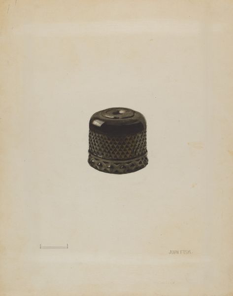 Curator: Let's turn our attention to "Inkwell," a pencil drawing dating back to around 1940 by Frank Fumagalli. It’s a small study in realism. Editor: My first impression is this drawing feels both sturdy and solitary. The inkwell looks very substantial, even a bit stubborn sitting there on the page, all by itself. Curator: It's a classic example of academic art, focused on precise representation and technical skill. I'm particularly interested in how the material – graphite – and technique serve to depict a common, yet often overlooked, tool. Consider the process: Fumagalli carefully builds tone with countless strokes to render the surface and form. Editor: Right. It feels meditative. I get a real sense of Fumagalli's observation and concentration. I imagine him closely studying how light reflects off the inkwell's surface and mimicking its carved lines using his pencil. And even the paper adds something – its age makes the subject feel old, steeped in the past. It is so detailed that, I can almost smell the ink. Curator: Indeed. The choice of depicting something functional is noteworthy. We can think about this drawing as situated in a tradition of studio exercises, or, conversely, consider how elevating such an object grants importance to the labour of writing and artistic production that it enables. Editor: Well, it also seems slightly romantic. There's a certain nostalgia evoked by the object itself, isn’t there? A lost era of penmanship and thoughtful correspondence, replaced by our keyboards and screens. Curator: Precisely, our present understanding of communication differs from when inkwells held significance, where calligraphy held precedence over crude or hasty writing. This detailed, material engagement invites the viewer to consider that history. Editor: This tiny portal, really, through which great and profound literature once passed! Curator: So, we find in this subtle drawing an attention to material processes linked to broader issues of artistic production, craftsmanship, and even modes of historical communication. Editor: I think I'll stick with portal, that works for me! I really like this small ode to creativity and craftmanship.