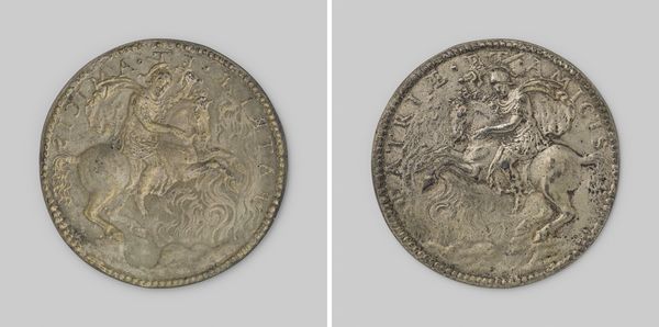 Curator: Take a look at this Mannerist relief from 1579, crafted by Jacques Jonghelinck: it's a metal portrait of Matthias, Archduke of Austria and Governor of the Netherlands. Editor: Wow, even in this digital rendering, I can almost feel the weight and coolness of the metal. There's a solemnity, a gravitas emanating from the portrait side, juxtaposed by something wilder on the other side with the nude figure. Curator: The duality speaks volumes. This wasn't just a straightforward portrait. The inscription, the imagery of Victoria—it’s about power, negotiation, and fraught times in the Netherlands. Editor: I am immediately interested in that visual tension. On the portrait side, there's incredible detail in the ruff, capturing the material itself. On the reverse, what are those serpentine forms beside the figure, almost Medusa-like? Curator: Exactly! The other side is Victory herself. It's interesting to consider how Jonghelinck combined classical iconography with contemporary political messaging. What’s really interesting is examining his role not just as a metalworker but also as Master of the Mint; his access to materials was also key to his process and social role. Editor: Yes, considering that relationship to materiality—the economic system intertwined with representation...and the skill required to render these miniature details on such a tough material! Did he oversee a workshop where others might've helped execute the fine details, like the lettering? What would that division of labor look like? Curator: Likely, yes. That's important context for understanding how workshops were organized at this time. Considering this artwork offers an excellent point to consider what "skill" even signifies within the art world. And also a fascinating look into the political theater being produced through this coin or medallion during the Habsburg reign. How does propaganda impact its process? Editor: Absolutely. This work demonstrates how the Renaissance intersected with growing early-capitalist models of artistic production, too. It reframes a seemingly straightforward political token into a question about material value. Curator: The social contexts certainly shaped every curve of the metal, influencing who and how power was being circulated in the Netherlands, during the fraught end of the Renaissance.