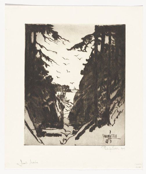 Curator: Lovis Corinth's lithograph, "The Valley, from Early Spring in the Mountains," possibly created in 1922, presents us with a stark landscape rendered in monochrome. Editor: The immediacy of the mark-making strikes me first. The scene feels almost violently rendered, not what one expects from "early spring". Curator: Indeed. The etching technique employed lends itself to the graphic quality, the stark contrasts emphasizing the scene’s inherent drama. Note the deliberate use of light and shadow. The interplay creates a depth that belies the apparent simplicity. Editor: I'm particularly interested in the labor evident in the medium. Look at how the varying pressures used when etching produce the emotional effect of harsh weather conditions. Was the artist perhaps commenting on material constraints when choosing these rapid processes? Curator: Perhaps, or one might consider the expressionistic elements dominating this period, where subjective experience transcends mimetic representation. The forest isn’t just depicted; it’s felt. Consider how the trees in the foreground seem almost to claw at the sky. Editor: The composition places the viewer on unstable ground, observing bare materials arranged according to human intentions and interventions—paper, ink, and artistic license! What can these textures reveal about 1920s German culture's attitude towards natural landscapes and resource extraction techniques? Curator: We can examine the underlying symbolic content. Consider the motif of the valley—a liminal space between heights, suggestive perhaps of transition and uncertainty, reflecting the socio-political milieu of Weimar Germany. Editor: The materiality itself adds layers, then, to understanding Corinth’s Valley. How the act of etching and printing becomes a mode of inquiry into broader concerns regarding the consumption of landscapes, for instance. Curator: A compelling thought. Ultimately, it showcases Corinth's profound engagement with not only the observed world but also its internal emotional landscapes. Editor: It certainly invites one to look beyond just the scene itself and into the conditions that facilitated the artwork's very creation and circulation.