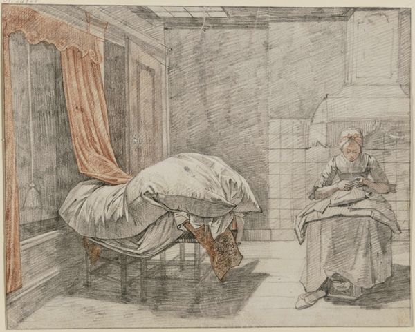 Curator: Henry Singleton's watercolor, titled "The Poet," offers a glimpse into a private, perhaps impoverished, domestic scene. Editor: My first impression is the somber mood; the light feels filtered, almost oppressive. The material austerity is palpable. Curator: It's interesting to consider the societal expectations placed on artists and writers of the time, and how that tension manifests in the humble presentation of this creative space. Notice the barred window and its implications. Editor: Precisely, the bars seem not just structural but symbolic of constraint. Look at the tools of the trade: simple desk, few sheets of paper, and a bottle. It speaks volumes about limited resources. Curator: I agree. This image prompts reflection on the intersection of artistic pursuit, class, and gender. Was this figure supported or marginalized? Editor: It certainly challenges romantic notions of artistic life, grounding it in the reality of labor and the materials at hand. Curator: A powerful reminder that artistic creation is often intertwined with complex social and economic conditions. Editor: Indeed, Singleton presents the poet not as a genius in isolation, but as a worker within a material world.
