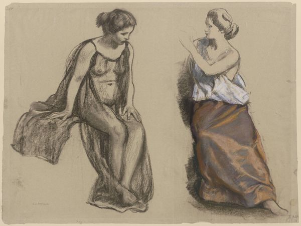 Curator: Barbara Elisabeth van Houten created this double study, "Twee studies van een vrouw, zittend op een kruk, op de rug gezien", sometime between 1872 and 1950. It's rendered in pencil. My immediate reaction is one of gentle observation, almost a silent glimpse into someone's private moment. Editor: Silent, yes, and focused, I think. Look at the density of the pencil work suggesting the weight of the fabric and how it drapes, probably woven from wool or perhaps even linen given the period. It looks like a laborious piece to manage as daily wear; such different connotations compared to our relationships with material and clothes today. Curator: Exactly. And isn't there something poignant in the averted gaze? We are offered only her back, her posture...I feel almost a shared intimacy with the artist, invited to witness something quiet and personal. The lightness of the pencil gives it an ephemeral, fleeting quality, like a memory. Editor: Fleeting for us perhaps, but consider the labor. The physical act of sketching, repeated and refined in these two studies—the lead wearing down, the sharpening, the specific pressure needed for each line... these gestures towards making allude to the time and effort shaping someone's dress or a workday toiling with textiles. There is that beautiful loop between artist and sitter both enacting repetitive hand motions that I find compelling. Curator: I hadn’t considered that loop in that way, between the artist and subject enacting labour – fascinating. To me the sketch, its incomplete quality, it really draws the eye inward. It resists closure, leaving room for imagination, for our own stories to fill the void of the unseen face. It's a testament to the power of suggestion, the beauty of the unfinished. Editor: Perhaps this incomplete quality alludes to a type of "economy of means" wherein limited material and economic resources resulted in efficient and stylized sketches focused on core structure and essential qualities; It reminds me how deeply production can be connected to expression. Curator: I am always intrigued at the immediacy, to that relationship. The artist invites us into a subtle meditation, to linger over a figure that time itself appears to have forgotten. Editor: Yes, and perhaps remembering those nameless labors through these objects grants both artist and sitter new representation.