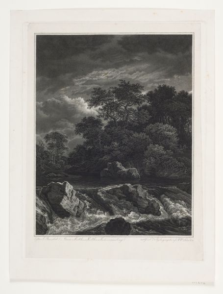 Editor: This is "Berglandschap met waterval," or "Mountainous Landscape with Waterfall," an etching by Johannes Arnoldus Boland, created sometime between 1860 and 1900. It feels both wild and melancholic. The stark blacks and whites emphasize the untamed nature. What captures your eye the most about this piece? Curator: For me, it's that push and pull you described. The etching embodies the Romantic spirit, this simultaneous awe and fear of nature’s power. See how the delicate lines suggest the mist rising from the waterfall, but the dark, almost aggressive, shading of the rocks speaks to its unyielding force? Editor: Yes, the textures are really dynamic, especially for a print! It’s like the waterfall is both turbulent and serene. I also noticed the structure perched atop the distant hill – is it meant to symbolize something, maybe the triumph of civilization over nature? Curator: Perhaps...or maybe the inevitable decay that awaits everything, even the seemingly permanent mountains. I love that we can both look at that small, almost insignificant, architectural element and draw such different, equally valid, conclusions. What does that say to you about Boland’s intention, or even about the work itself? Editor: It suggests the landscape is open to interpretation, more of a mirror reflecting our own thoughts and emotions than a statement itself. Which is, now that I think about it, kind of the point of Romanticism! Curator: Precisely! The beauty is found not just in the scene depicted but in the feeling it evokes within us. These etchings, in their seeming simplicity, ask complex questions of the viewer. I'm leaving with a sense of wonder, tinged with the sublime, aren’t you? Editor: Absolutely. I never thought a little waterfall could be so philosophical! Thanks for your perspective.