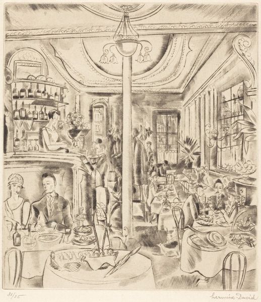Martin Monnickendam made "Bij den Juwelier" with watercolor, and it’s all about capturing a moment, a kind of fleeting glimpse into a jewelry store. The way he uses these watery blues and browns, it feels like a memory, soft around the edges. Look at how the light from the chandelier blurs, almost dissolving into the ceiling. The paint is so thin, so transparent, it's like he's barely touching the surface. It’s like he’s saying, this isn't about precision, it's about the overall feeling of being there, the hustle and bustle of shoppers. The faces are just suggestions, hints of features, but you get the sense of their attention, all drawn to the sparkle of the jewels. This reminds me of Vuillard, how he captured intimate, domestic scenes with a similar kind of hazy, dreamlike quality, and both understood that sometimes, the most interesting thing is what's left unsaid, unpainted.