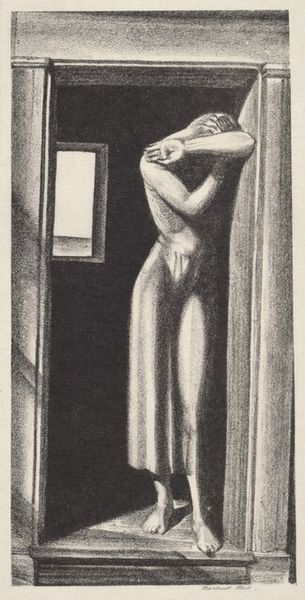 Curator: "A Distinguished Audience" by Alexander Zerdin Kruse, created around 1930. The piece is a modernist portrait rendered in charcoal, primarily as a print. What strikes you most immediately about it? Editor: The composition feels immediately unsettling, yet controlled. The juxtaposition of the clergyman's placid countenance with the hand-standing boy—is that a power dynamic at play? What are your initial thoughts on the technique itself? Curator: The texture is what initially draws my focus; the artist’s command of charcoal. You can feel the texture of the paper, the layering of the pigment to create depth, the varying pressure he used to describe form, and even the craft inherent in printmaking elevates the piece. It feels very tactile, almost sculpted. I am very curious what its statement on religious structures during the modern era are, though? Editor: Right! Kruse seems to be questioning traditional hierarchies here. The Bishop, a figure of established authority, observes passively while a young person literally upends himself—his perspective. Perhaps it is about the way new generations challenged and questioned the Church. The title drips with irony too. The child is also being presented like entertainment in front of some “distinguished audience”, creating an analogy between religion, institutions and exploitation. Curator: Exactly. Consider the paper and ink used in mass-produced prints—a stark contrast to, say, oil on canvas commissioned by the Church itself during the Renaissance. Here, Kruse employs accessible materials, subverting established systems of artistic patronage and value. This is also the time of technological progress, urbanization and political conflict so that's always a very good time to make bold statements on structures of power, and explore other perspectives on art and how it should be done. Editor: And that subversion makes the work inherently political. By visually disrupting traditional notions of authority and viewership, Kruse forces us to question the roles and power structures at play, both in the depicted scene and within the broader social context of the time. Curator: In effect, Kruse acknowledges his labor to comment about hierarchies of value inherent within both art production and societal systems and critique both. I agree with that, and it helps create context for the art, especially considering when it was made. Editor: Ultimately, this piece, both formally and conceptually, challenges us to examine the systems of power that shape our understanding of art and society. It is unsettling. Curator: I’ll leave appreciating the charcoal's mark-making then; that’s my truth to beauty with this drawing today.