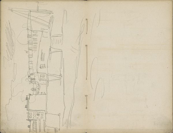 Curator: This drawing, titled "Huis en molen aan een waterkant," or "House and Mill on a Waterfront," comes to us from Jan Willem van Borselen, around the 1860s-1870s. Executed in pencil on paper, it offers us a glimpse into the artist’s process. Editor: It's fascinating! The gridded page on the left emphasizes the freedom of the drawing on the right. The initial impression is so ethereal; everything is suggested rather than definitively rendered. Curator: The composition is particularly intriguing. Borselen uses the grid to seemingly anchor one side, leaving the other free for an exploration of form. Look at the sketched windmill; notice the complex geometry conveyed with very few lines. It’s like a puzzle being assembled right before our eyes. Editor: The windmill is definitely a powerful symbol here, and mills historically represent industry and the transformation of natural resources. Combined with the domestic scene hinted at—the “huis” or house—one wonders about the values this placement embodies, the relationship between the man-made and the natural world. Curator: Precisely! He masterfully employs line weight to suggest depth and shadow, despite the sketch's minimalistic nature. Notice how a darker stroke gives the suggestion of solid structure, implying mass through tonal variation rather than contour. Editor: It invites reflection on the cultural impact of technology and industrialization in the landscape. Is it a harmonious integration, or does the windmill impose upon a more peaceful domestic sphere represented by the home? The symbols raise many questions without overtly giving answers. Curator: The juxtaposition amplifies the study's contemplative mood. By displaying the raw materiality of the medium and process, he reveals, rather than conceals, his practice. Editor: I concur, examining this drawing gives a greater sense of Borselen’s world, and of how potent even the simplest forms can be. Curator: Indeed. It leaves us considering how so few precise lines can generate so much rich symbolic texture.
