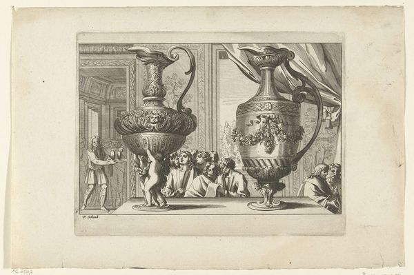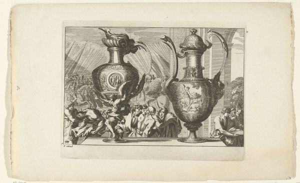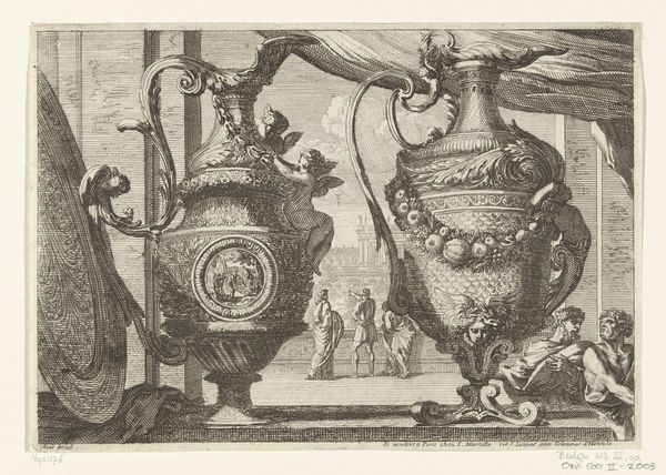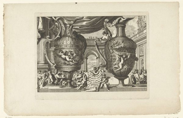 Jean Lepautre created this print, "Two Ewers," with etching techniques, sometime in the 17th century. The eye is immediately drawn to the ornate vessels, their forms dominating the composition. The etching skillfully renders the texture and elaborate detail of the ewers, contrasting with the more open, airy depiction of the figures and architectural backdrop. Light and shadow define their rounded shapes and decorative elements. The placement of the objects against the background suggests a dialogue between the decorative arts and the broader cultural landscape. The ewers, symbols of luxury and refinement, invite us to consider the values of the society that produced and appreciated them. The rigid verticals of the architecture in the background and soft curvature of the ewers is an interesting compositional element that places emphasis on the symmetry of the image. The function of these visual elements challenges fixed meanings and encourages us to question the relationship between art, culture, and perception.