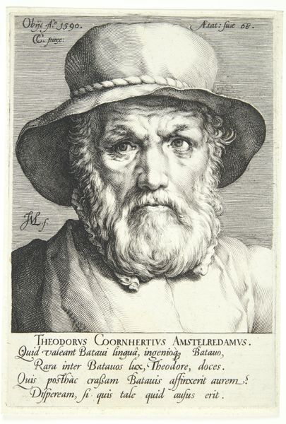 Curator: This is Jan van Londerseel's rendering of Dirk Volkertsz Coornhert, etched sometime around 1590. It's now part of the Harvard Art Museums collection. Editor: He looks rather severe! The contrast between light and shadow emphasizes his stern expression, capturing, perhaps, the intensity of his gaze. Curator: Indeed. The meticulous line work creates a sense of texture, almost tactile. Consider how the artist uses hatching to define form and volume. Editor: The Latin text beneath the portrait suggests Coornhert's significance as a writer and theologian. How might his radical ideas have shaped his portrayal? Curator: The engraving technique itself becomes a vehicle for expressing intellectual rigor. The clarity and precision mirror Coornhert's own pursuit of knowledge. Editor: A fascinating interplay between artistic form and historical context, revealing layers of meaning beyond a simple likeness. Curator: Precisely, inviting us to consider the visual and intellectual landscape of the time.