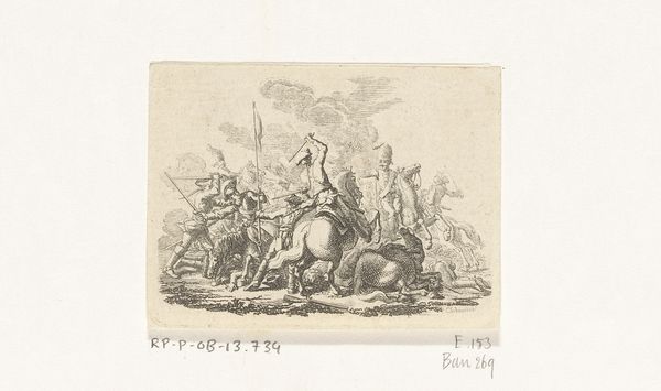 Editor: Here we have Daniel Nikolaus Chodowiecki’s etching, “Don Quichot op de bruiloft van Kamacho,” made around 1770. It has such fine lines, but seems so full of energy, depicting a scene packed with people and details. What grabs your attention most about it? Curator: Well, for me, the appeal lies in how this etching reveals the artist's labor and the means of production in 18th-century printmaking. Notice the detailed hatching and cross-hatching. That speaks to the hours of painstaking work involved. The choice of etching itself, as a reproducible medium, suggests an intention to disseminate this narrative widely. Editor: That's interesting. I was focusing on the figures and the story. So you see it more as an object relating to broader production of printed images? Curator: Precisely. Consider the social context: the rise of illustrated books and printed ephemera. This wasn't necessarily "high art" in the traditional sense, but part of a burgeoning visual culture that made stories more accessible to wider audiences. This makes one think of questions surrounding accessibility. Is fine art necessarily elitist, and how do popular, mass-produced works challenge these boundaries? Editor: I see what you mean. The print medium makes it more accessible to everyday people rather than displayed as a painting only the rich could see. I didn’t realize the etching itself was part of a bigger picture in visual culture! Curator: Exactly! And looking closely at the plate itself. The wearing of the plate reveals the materiality and inherent degradation involved in art. It is an indication of a social, economical, and art historical context, showing insight into 18th-century artwork creation and society. Editor: I learned to think about an etching and a painting as a cultural artifact as well as how art touches everyone regardless of where they are placed in society. Thanks for this deeper, new understanding! Curator: My pleasure. Looking beyond the immediate image unlocks these narratives!