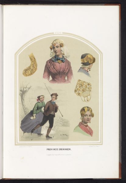 Ruurt de Vries created this print in 1857, showcasing the traditional costumes of Zuid-Beveland in Zeeland. It was made using lithography, a process that allows for detailed, reproducible images. What strikes me most is how this print acts as a record of craft and its cultural significance. Each element of the clothing, from the bonnets to the metal clasps, represents countless hours of skilled labor. The materiality of the costumes speaks volumes about the community’s values, the availability of resources, and the importance of visual identity. Consider the textures of the fabrics, likely linen and wool, reflecting local agriculture. Notice too the metalwork – these weren't mere decorations; they signified status and were passed down through generations. The print itself, through its methods of production, also mirrors the rise of industrialization and its impact on traditional crafts. This image isn't just a depiction of clothing; it's a document of material culture, craftsmanship, and social identity, capturing a moment in time when these traditions were both celebrated and challenged by the forces of modernity.