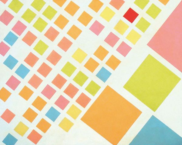 This is Piet Mondrian's "Composition with Grid IX," made with oil on canvas. I love seeing how Mondrian works through process. Here we have this wonderful, almost pastel, grid of colors, each contained within a strict, regimented set of lines. But it's so much more subtle than that, isn't it? Look how thin the paint is, almost like watercolor in places, with the texture of the canvas just barely peeking through. And notice the way the colors interact; that soft pink square sitting next to a cool blue one, and how they almost seem to vibrate against each other. Think about someone like Agnes Martin, who worked with similar grids, but whose touch was so much more subtle and ethereal. With Mondrian, it's like he's building something solid, brick by brick, even as he's inviting us to question what those bricks are made of. It's painting as architecture, or maybe architecture as painting. Whatever it is, it's beautiful.