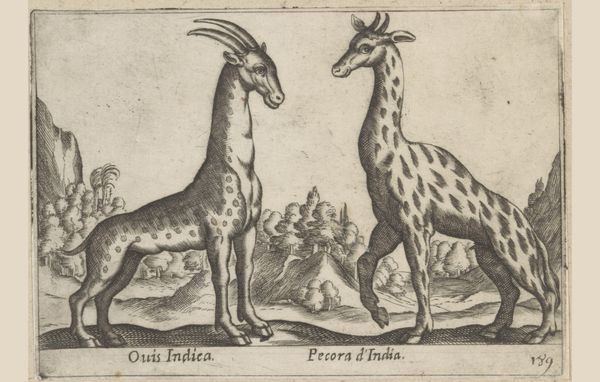 Editor: So this engraving is called "Giraffe", made before 1650 by Antonio Tempesta. It's held in the Rijksmuseum. I'm really struck by how strange it looks, not quite like any giraffe I've seen. What does it make you think about? Curator: It's interesting you say that. Representations of animals, especially exotic ones, were often filtered through existing cultural understandings. This image likely says more about the *idea* of a giraffe in Europe before 1650 than the actual animal. What sort of knowledge, if any, did the artist have about giraffes, and how would it have been mediated? Did they have access to reliable sketches, descriptions, or even the animal itself? Editor: That’s a good point! I hadn't considered the role of second-hand descriptions. Curator: Exactly. Notice how the giraffe is placed in a very European-looking landscape? It tames the exotic animal by placing it in a familiar context, shaping its perception for a European audience. Editor: So the environment is less about accuracy and more about making it digestible for viewers? Curator: Precisely! And think about the implications of owning, displaying, and illustrating such creatures. What did this mean in terms of power dynamics, colonial ambitions, and the control of the natural world? Editor: This makes me wonder about the original patrons, too, and what statement they were trying to make. Thanks for opening my eyes to that! Curator: And I appreciate your reminding me how potent first impressions are, and how vital it is to consider how these images can be shaped. It highlights the constructed nature of even seemingly straightforward depictions.