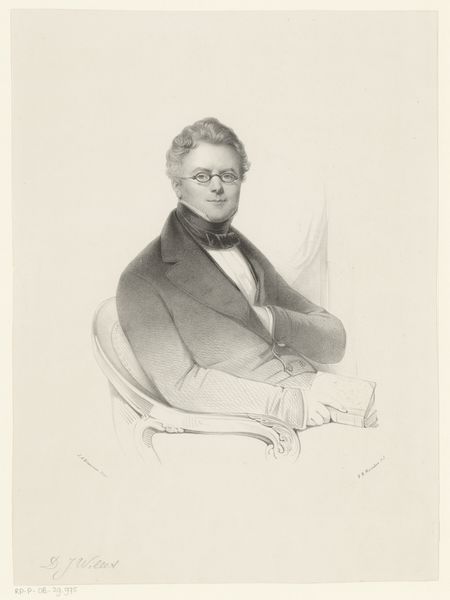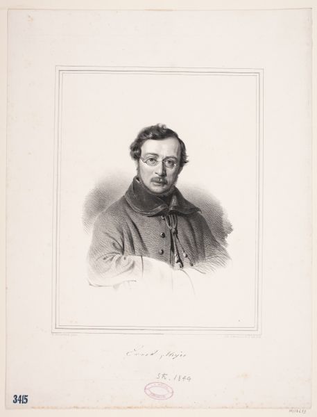 This is a portrait of an unknown man, possibly Mr. Nessebrode, made by Christian Hoffmeister using etching and engraving. The subject is depicted from the chest up, set against a neutrally shaded background, enclosed within a rectangular border. Hoffmeister’s formal precision is evident in the minute details of the man’s attire and features; the etched lines create subtle gradations that model the form. The sitter’s slightly asymmetrical features, enhanced by his spectacles, suggest both individuality and a candid realism. Hoffmeister skillfully employs a range of etching techniques to render textures and surfaces. The hatching and cross-hatching are not just descriptive, they also serve to articulate space and volume, pushing the figure forward. Consider how the meticulous rendering of the sitter's garments contrasts with the relatively flat treatment of the background. The print transcends mere representation, engaging with broader questions about identity, appearance and the structures of portraiture itself.