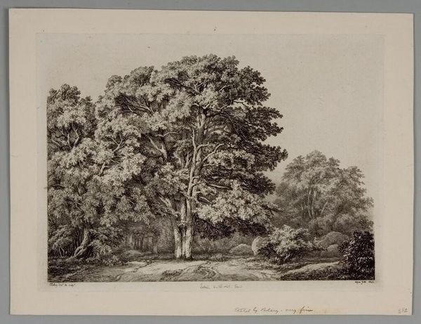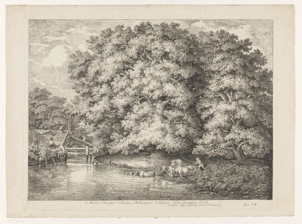 Editor: This is Johann Christian Reinhart’s "Mill by the Great Oak." I’m struck by how imposing the oak is, almost a silent guardian. What do you see in this piece? Curator: The oak, a symbol of strength and longevity, dominates. The figures and mill are dwarfed, suggesting nature's enduring power over human endeavors. Do you think the artist implies a certain vulnerability or respect? Editor: Maybe both? The figures seem to live in harmony with nature, but the oak's scale suggests something timeless. I didn't expect that. Curator: Reinhart captures a cultural memory, of nature’s supremacy, echoing in our subconscious the respect and fear it can instill. A powerful symbol indeed.