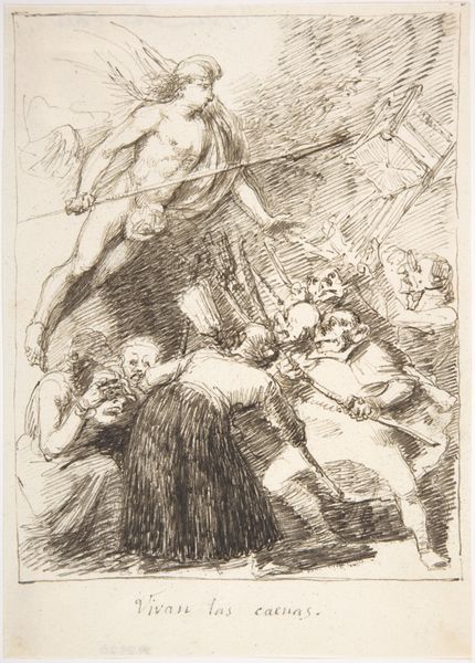 Editor: Here we have "The Lovers," a 16th-century print currently residing in the Metropolitan Museum of Art. Looking at this pen sketch, I am intrigued by the visible strokes which give a strong textural sense. How would you interpret this piece? Curator: Considering its materiality, notice how the artist’s hand is ever-present in the etching technique. Each line speaks to the physical labor and deliberate action of the artisan who originally made it. But think also about its existence as a print. How does the accessibility afforded by the medium alter the concept of art as an object of elite consumption? Editor: That's interesting. So, the means of production influence how we perceive its value? Curator: Precisely. A print, by its very nature, suggests a wider audience, a broader dispersal. The very act of reproduction changes art's relationship with society and even undermines the notion of originality. It allows us to engage with what could have been considered elite subjects, such as mythology, outside of the courtly environments or church setting, for which many of them were originally produced. Where does this shift of access through production leave us today? Editor: That's a great question. It really puts this image, "The Lovers", into a wider historical and cultural framework, far beyond the idea of simple love between a man and a woman. It speaks of power dynamics related to access, production, and consumption, which I had not considered initially. Thanks for opening up a new interpretation for me. Curator: The layers of artistic creation unveil even deeper understandings when viewed with cultural and economic elements in mind. Considering these forces brings awareness to the artwork's societal and personal meanings.