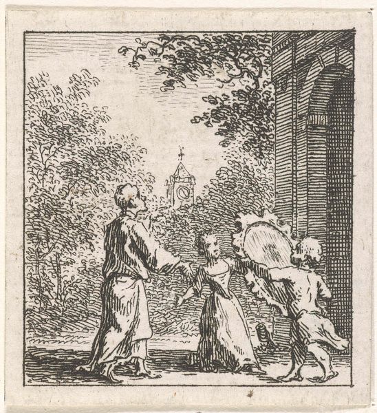 Bartholomeus Breenbergh created this print, Ruïnes van de tempel van de Zon en de Maan bij het Colosseum, using etching techniques. The composition is structured around a stark contrast between the dark, textured foreground and the light, airy distance. Breenbergh employs a high horizon line, pushing the landscape down and emphasizing the towering ruins on the right. Notice how the ruins are rendered with a meticulous network of lines, creating a palpable sense of decay and mass. This contrasts sharply with the delicate, almost ethereal treatment of the distant landscape. Semiotically, the ruins function as signs of a glorious past, now eroded by time. The figures scattered throughout the scene, dwarfed by the architecture, reinforce a sense of transience. The lines and forms destabilize any fixed meaning, prompting reflection on the ephemeral nature of human achievement. The texture and form engage in a visual discourse about time, memory, and the sublime.