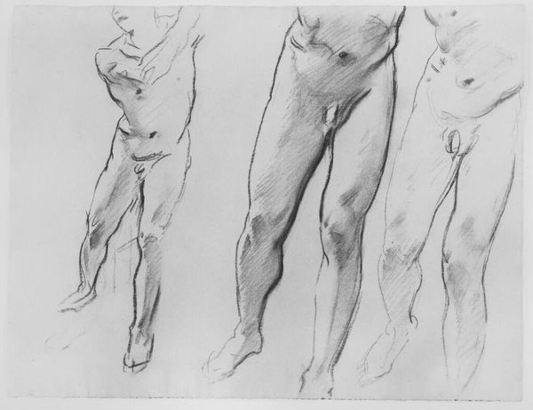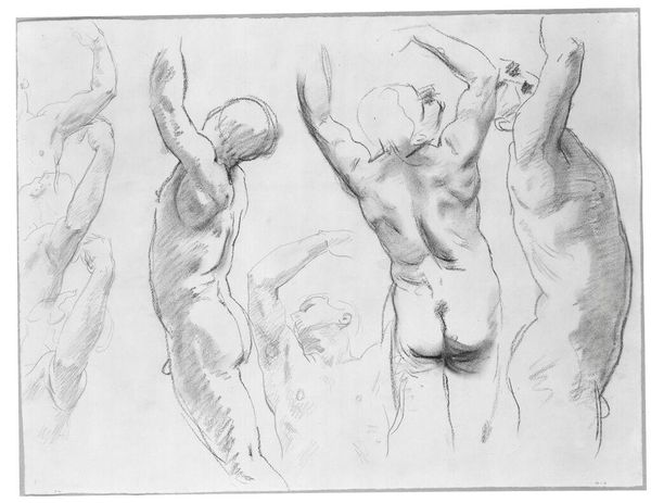 Curator: There's a striking sense of classical dynamism in John Singer Sargent's "Two Studies of Boreas (North Wind) for 'The Winds.'" It's a preparatory drawing for a mural, part of a larger series exploring mythological figures. Editor: It feels ethereal, almost weightless, despite the muscularity of the figures. There's a subtle tension between power and grace that captures my attention. Curator: Sargent was deeply embedded in the artistic and social circles that were invested in the Beaux-Arts classicism, which greatly influenced his approach to representing myth. The male nude, here, becomes this conduit for expressing cultural ideals. Editor: Right, and thinking about the north wind as a symbol, it’s interesting how Sargent seems to temper any association with brute force. Instead, there's a vulnerability in their upward gazes, a sense of longing. We see these ideas reflected later, especially as the male form becomes more radicalized within social discourse. Curator: Indeed, and situating this work within Sargent's broader oeuvre, as well as the visual culture of his time, we can see how he both participates in and subtly challenges prevailing notions of masculinity and mythological representation. Editor: Exactly. It makes you consider the social expectations, and the inherent tensions within them. This really adds more depth to the work, and allows for many levels of interpretations.
