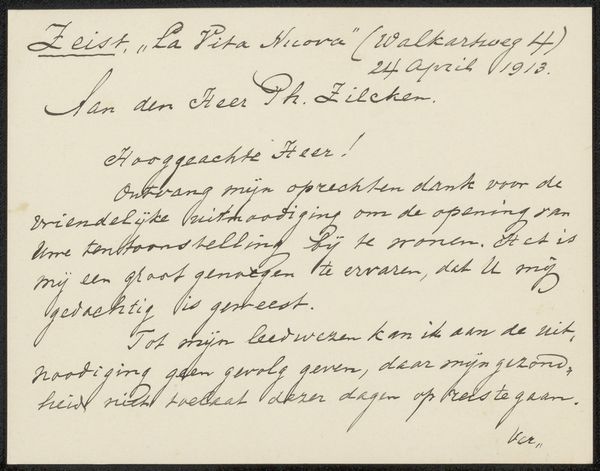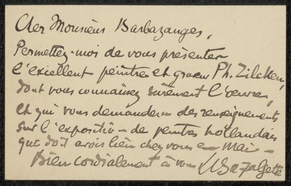 Curator: This is "Prentbriefkaarten aan Philip Zilcken", or "Postcards to Philip Zilcken," believed to be from 1921, by Ferdinand-Sigismund Bac. It's essentially a piece of ephemera: a postcard covered in densely written script. Editor: My initial feeling is one of intimacy. It's so personal, like catching a glimpse into a private conversation. The handwriting itself adds a layer of emotion—I sense a kind of urgency and warmth. Curator: The handwriting is key here. Think about who was producing and receiving these cards, and their purposes, as physical objects of communication within a specific network. The card also clearly has the line "This card cannot be sold except to the profit of the War Wounded and Orphans." This was at a time when there were a lot of War Wounded individuals, many of which were abandoned by institutions, and relied on alternative economies to get by. It becomes something more than a note. Editor: That inscription, its location in proximity to both the place for addresses and correspondence, creates an odd tension with this intensely personal communication. Is the artist exploiting a program of good-will to support traumatized veterans, or highlighting the contrast between mundane pleasantries with someone when a society that produced so much destruction is on the fringes? Curator: It's an incredibly interesting layering. Bac was connected with several artists and figures on the cultural left at that time. Knowing this, I am tempted to read the artist deploying some sarcasm, or dark humor, that many were sharing at this moment when many people questioned everything as traditions seemed to be breaking. Editor: Perhaps this highlights the complexity of identity, especially the privileges one is afforded, relative to the marginalized. These small postcards hold vast political and social implications within the broader tapestry of interwar society. Curator: Examining this postcard allows us to think about how everyday communications were intertwined with significant historical moments. Thanks for teasing this piece apart with me. Editor: Absolutely. It shows the potency and fragility of art as a means of personal connection.