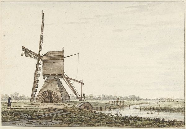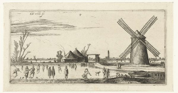 Anthonij van der Haer's "Molen langs een rivier" is an etching that captures a serene waterside scene with a meticulous eye for detail. The composition is structured around the strong vertical of the windmill and its juxtaposition with the horizontal landscape. The textured thatched roof of a nearby structure and reflections in the water create a play of light and shadow. Van der Haer skillfully uses line to define form and texture, creating depth and atmosphere. We see this in the rendering of the clouds, the subtle ripples on the water and the intricate detailing of the mill's structure. The figures in the boat, the ducks swimming in the foreground, and the people on the balcony add human elements. This etching uses its formal elements to engage with ideas of nature, rural life, and the picturesque. The artist's structured approach invites us to appreciate not just the scene, but also the formal qualities that shape our perception and understanding of the world. The artwork invites contemplation and interpretation.