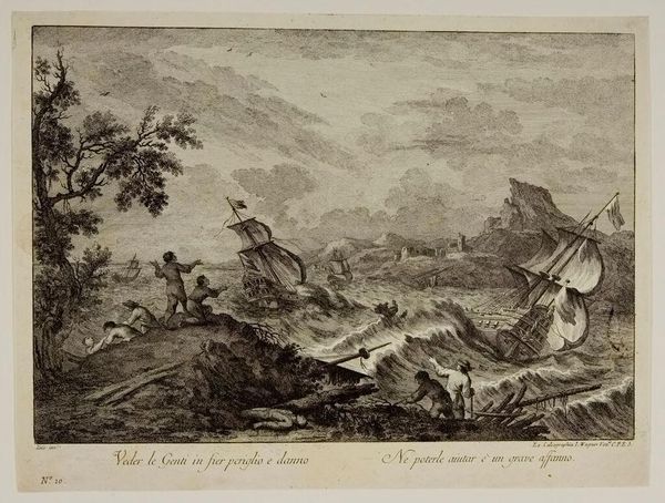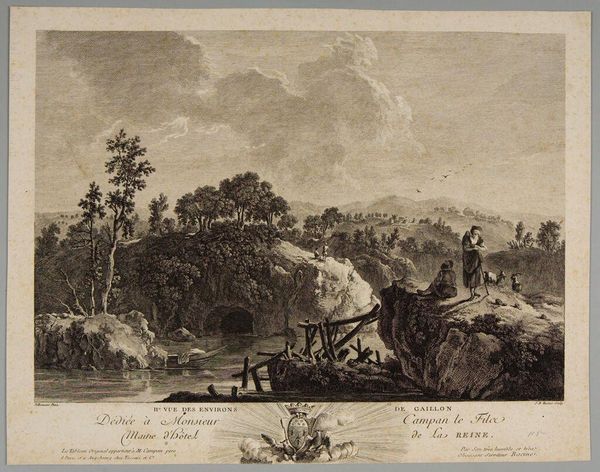 Curator: This is Friedrich Wilhelm Gmelin's "View of the Falls of the Rhine at Lauffen near Schaffhausen," housed right here at the Harvard Art Museums. Editor: It's overwhelmingly grey. The churning water, the sky, the rocky landscape—it all feels rather bleak, like industry has already touched this place. Curator: Interesting. I see it as a commentary on the sublime, but viewed through the lens of burgeoning modernity and the socio-political upheaval of the late 18th century. Those tiny figures feel so dwarfed by the natural forces at play. Editor: I am drawn to the material reality of those churning falls. It feels like Gmelin really understood the immense labor required to harness that water, even in 1790-something. The potential for energy, for work… Curator: Yes, and think about who had access to the Rhine's resources. Issues of class, land ownership, and access become central to understanding not just the landscape, but who benefits from it. Editor: Exactly. These landscapes aren't just picturesque; they're loaded with potential energy, with the social implications of natural resources ready for exploitation. Curator: A stark reminder that our relationship with nature is always mediated by power. Editor: Absolutely. It grounds the sublime in the very real struggles for resources and control.