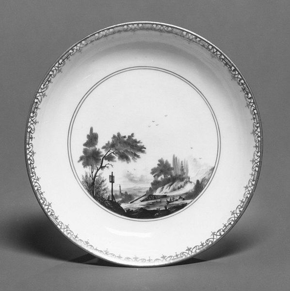 Curator: Here we have an 18th-century saucer, crafted at the esteemed Meissen Manufactory. The delicate porcelain provides a canvas for a miniature landscape, painted in tempera. It’s currently housed at the Metropolitan Museum of Art. Editor: It's stark. The limited monochrome palette gives a distinctly wistful quality, doesn’t it? The circular format confines the scene almost like a framed memory. Curator: Indeed. Pieces such as this speak to the rise of porcelain as a marker of status and refined taste during the 18th century. These objects weren't merely functional; they were vehicles for expressing cultural sophistication. Editor: I’m immediately drawn to how the artist constructs depth using only subtle gradations of tone. Notice the bare tree mirroring the figures on the bridge? This composition creates a narrative within its strict pictorial space. Curator: Precisely! This relates to a broader enthusiasm for landscape painting among European aristocracy, now manifested on a smaller, more domestic scale. These picturesque motifs, like the bridge, represent ideals of beauty but also a command of nature. Editor: The scene itself, with figures and a simplified natural backdrop, almost feels theatrical. The bridge appears as a stage for observing life's simple movements. Curator: Exactly, these pieces were often commissioned for entire services meant to convey an elevated lifestyle. Imagine the dinner party conversations sparked by such detailed and artistic porcelain! Editor: Looking at the painted border—almost abstracted nature—it contrasts and complements the miniature within. It invites reflection not only on the craftsmanship but also on its intrinsic design choices. Curator: Its ubiquity in museums today often blinds us to its role as both aesthetic and propaganda, shaping cultural norms surrounding domesticity. Editor: Absolutely. Thinking purely in pictorial terms though, I appreciate the precision and care given to it, something we too easily overlook today. Curator: Ultimately, viewing an object like this offers us insight into the complex cultural landscape of 18th-century Europe and beyond. Editor: And aesthetically, in just this humble saucer, one glimpses an extraordinary world encapsulated within a circle.