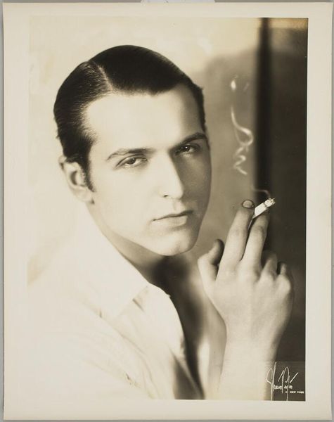 Curator: What strikes me immediately is the air of mystery and melancholy radiating from this portrait, a beautiful photograph of a man in a hat by Strauss-Peyton. Editor: Absolutely. The hat itself is a powerful symbol, both a shield and a statement. It suggests a desire for anonymity, perhaps, but also projects a certain sophistication. The shadow it casts hints at hidden depths. Curator: Exactly. It’s a study in contrasts, isn't it? The sharp lines of his suit and tie against the soft focus of the background. The way the light catches the curve of his cheekbone, drawing you in. Editor: Yes. The hat can represent an archetype of disguise, even in modernity. A symbol of the unknowable self, particularly in the age of celebrity portraiture. Curator: And it’s interesting how this image, in the Harvard Art Museums collection, remains untitled. The mystery deepens because we’re left to project our own narratives onto him. Editor: Which is the point, perhaps. We are all men in hats, to some extent, aren't we? Hiding, revealing, performing. Curator: A poignant thought to carry with us, isn't it?