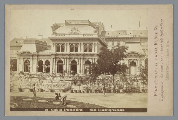 Editor: So, this is "Slot Sanssouci te Potsdam," a photograph by Johann Friedrich Stiehm, from 1879. It looks like an albumen print. The building itself feels very imposing, almost austere, and the men standing on either side of the staircase seem dwarfed by it. What do you see in this piece? Curator: Well, the choice to include figures at the base immediately invites a conversation about power dynamics and spatial control. It’s interesting to consider how the photographer situates the viewer in relation to the palace. Are we meant to identify with those figures? Does the Romantic style evoke a sense of longing for an idealized past, one reserved for the elite? This albumen print gives us detail but also a soft aesthetic, that could make this romantic interpretation quite reasonable. Editor: I hadn't thought about the choice of those figures. Their clothing indicates they are from that era but I had only seen them as just regular people observing the palace, that softens the mood. Are they just 'common' men dwarfed by this powerful construction? Curator: Exactly! And within that framing, the photograph can be read as a commentary on class and access to spaces of power. The grand staircase could symbolize the barriers faced by ordinary people in accessing privilege. Who had real access to that staircase? We might question who the work truly serves and whose gaze it centers. Is this supposed to promote access or to emphasize the class differences? Editor: That completely changes my view! I was just seeing a pretty building. But when you frame it this way, the photograph invites you to examine the role that the palace plays as more than a mere tourist destination. Curator: Right. It is so critical to see beyond surface beauty and explore the complex socio-political narratives embedded within these seemingly straightforward landscape images. Editor: I’m definitely seeing more depth here now, especially in considering those overlooked figures. Thanks for opening my eyes to the layers of social commentary at play here!