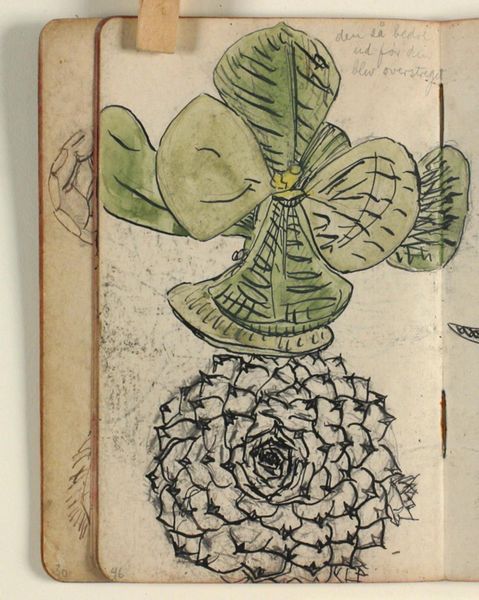 Niels Larsen Stevns created this plant study with pencil and watercolor, capturing a potted plant's essence. The plant emerges as a symbol of growth and the cyclical nature of life. Think of the ancient Egyptians, who revered plants like the papyrus, seeing them as symbols of regeneration and immortality. This echoes in Stevns's choice of subject; the plant, contained yet thriving, becomes a meditation on life's resilience. Consider the 'horror vacui' or 'fear of empty space', a motif that propelled artists to fill every inch of their canvases with patterns and figures. Here, the plant study is placed within the confines of the sketchbook page, contrasting the organic and untamed with the structured. This contrast embodies the tension between nature's boundless energy and humanity's attempts to understand and contain it. The plant is not just an object of study, but a mirror reflecting our complex relationship with the natural world.