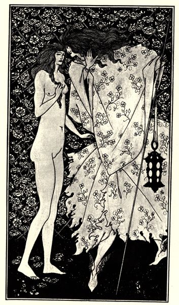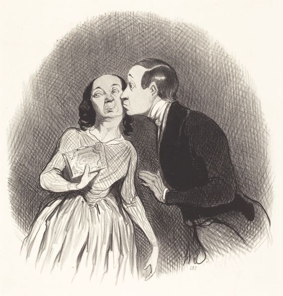 Curator: Here we have "Madrigal D'Avril", a striking lithograph created by Thèophile Alexandre Steinlen. What's your first impression? Editor: Erotic, definitely. With a splash of Belle Époque wistfulness. There's such immediacy to this image; a whispered confidence shared between two figures, all captured in those lovely rust-colored lines. It looks like an old poster that’s been faded by time, but only became better with it, like some wine, aged. Curator: Indeed, this piece functions as a poster, specifically a song sheet cover. Note the inclusion of typography to convey song’s name and related credits. This aligns perfectly with Steinlen's extensive involvement in advertising and magazine illustration. In looking at the cultural memory, it makes sense that many fin-de-siècle graphic artists created sheet music. It provided popular visual representations of musical romanticism. Editor: Exactly, there’s an undeniable romantic spirit. And this composition: the tilted heads, the suggestion of embrace, the female gaze that looks right past us. Curator: This gaze represents not only the spirit of romanticism in that time, but it embodies a broader narrative of yearning and delicate melancholia that had permeated cultural and artistic expression for years. Editor: Makes me wonder what Mademoiselle imagined after she cast that gaze, and what kind of mad love-and-art world did Steinlen want us to fantasize about back then. Curator: Food for thought! This drawing offers an alluring lens through which to appreciate the multilayered dimensions of romance and art's cultural value. Editor: Definitely. A peek into the passions and musings of another era.