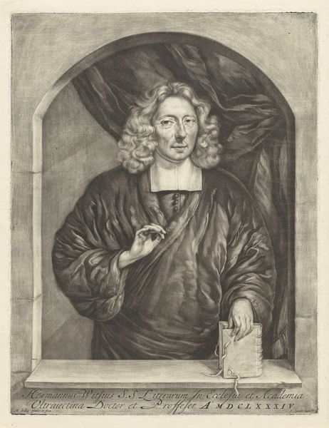 Curator: Let's turn our attention to this subtle pencil drawing titled "Portret van C. te 's-Gravezande" dating back to 1666, attributed to Dirk Druyf. It’s a fascinating window into the Dutch Golden Age and portraiture of the time. Editor: It has such an ethereal quality, doesn’t it? The pencil work is so delicate, creating a soft, almost dreamlike representation of the sitter. The textures are really interesting, especially the fall of light across the robe. Curator: Indeed. And it reflects, perhaps, the subject's station. Note the pose: relaxed, confident, beside what appears to be a table with writing implements and open books – implying intellectual pursuits, scholarly identity... The gaze is steady, conveying a sense of self-assurance. Editor: Right, the tools of their trade so proudly on display. But consider the medium itself, pencil, and its growing accessibility in the mid-17th century. Drawings, at the time, weren't necessarily lesser than painting. Pencils granted the artist great detail and flexibility that paint would have struggled to deliver with the same convenience. I'd be curious to examine the paper. Curator: A good point about the paper. We can observe too that the formal construction is typical of the Dutch Golden Age – calm, composed, realistic… though with a restraint, an understatement. And consider the networks Druyf may have circulated in. The rise of a merchant class, the expanding markets for art… it all impacts who is commissioning and consuming images like these. Editor: Absolutely, it highlights the evolving market. This work also seems more intimate, almost personal – perhaps intended as a study, or kept within a smaller circle. It makes me think of the role these portraits played in constructing identity. Curator: And remember how closely tied those identities were to profession and social standing! These images helped reinforce social hierarchies. So this drawing becomes more than just an aesthetic object. It represents the complex web of social, political, and economic forces at play during the Dutch Golden Age. Editor: Ultimately, its delicate rendering reveals the way artistic talent and technological innovation blended with social performance during a period of great social change and production. A simple lead point used to craft, to solidify one's identity through its marks upon a sheet. Curator: Precisely. Thank you for those insightful observations. It seems there’s much more to this drawing than meets the eye.