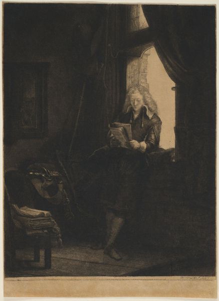 Editor: So, this is "Self-Portrait of Jan Steen as a Lute Player," made sometime between 1670 and 1724, a print after Jacob Gole. There’s such a joyous feeling radiating from this musician! The instrument, his posture, his expression all seem incredibly animated. How would you interpret this work? Curator: I see a powerful invocation of memory and cultural identity through symbols. The lute itself is far more than just a musical instrument. What associations does it conjure for you? Editor: Well, instantly, music and entertainment. Perhaps merriment? Curator: Exactly! In the 17th century, the lute often represented harmony, but also fleeting pleasures, vanitas. Steen, by portraying himself with it, positions himself within that dialogue. Consider also his slightly disheveled attire, and the drinking vessel in the background... Does that give you any other ideas? Editor: It hints at maybe a less-than-virtuous lifestyle? Like pleasure is winning out over restraint. Curator: Precisely. But here's the question: Is Steen judging himself, or embracing this image? Think about the theatrical drapery in the background – doesn't that suggest he’s consciously playing a role, crafting a persona? Editor: So he’s both participating and commenting on these themes through self-portraiture, acknowledging his part in this social tapestry? Curator: Yes. The image resonates because it acknowledges the complexities and even contradictions of human experience, using established symbolic languages that transcend time. What does that provoke in you now? Editor: Now I appreciate the layered meaning behind this seemingly simple image of a musician. It's much more profound than I initially realized. Curator: Indeed, by engaging with cultural symbols and personal narrative, Steen speaks to something enduring in the human condition.