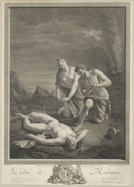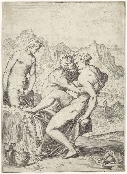 This engraving, titled "Five Nymphs in a Landscape", presents us with a study in contrasts and visual planes. The anonymous artist organizes the figures into a composition that simultaneously feels classical and oddly destabilized. Note how the starkness of the foreground, where the nymphs are casually posed, sharply contrasts with the softer, dreamlike quality of the landscape. The figures themselves, rendered with a sculptural precision, seem almost superimposed onto the background, creating a spatial disjunction. Consider the use of line and shadow: the artist employs sharp, definite lines to define the bodies, highlighting their three-dimensionality, while the landscape dissolves into hazier tones, almost as if receding from tangible reality. This contrast invites a semiotic reading, where the nymphs represent a certain ideal of form and beauty, set against nature. The overall effect is one of estrangement, as if the artist is deliberately challenging conventional notions of space and representation, suggesting a rupture with traditional aesthetic values.