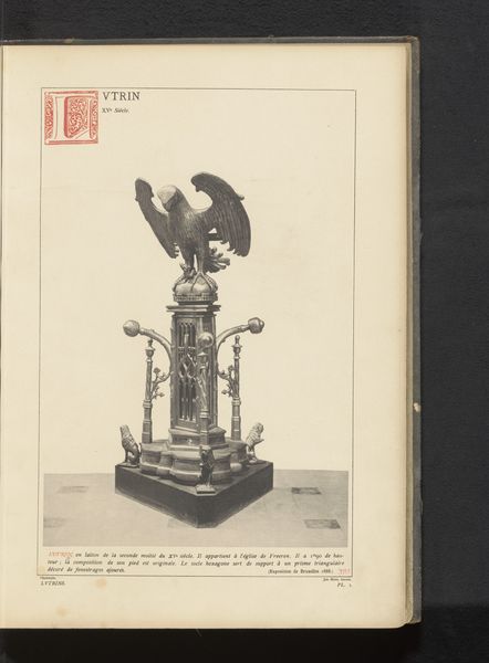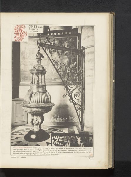 Editor: This is a gelatin-silver print from before 1887, showing the Messing doopvont (brass baptismal font) in the Sint-Martinusbasiliek in Halle, Belgium. The grayscale and aged look of the print lend the image a serene quality, almost like looking at a faded memory. I am fascinated by the ornate gothic tracery of the Basilica behind the baptismal font and the metallic texture of the piece itself. How do you read this work? Curator: Primarily, I am interested in the formal relationships established by the photographer. Note how the geometric severity of the baptismal font plays off against the intricate gothic details in the architecture of the Basilica, and further notice how the artist exploits contrasts to organize forms and create an overall harmony within the piece. Do you perceive, as I do, a skillful arrangement of forms creating depth within the composition, given that it is a monochromatic photograph? Editor: Yes, the way the light falls definitely emphasizes the textures, offering contrast and therefore visual depth. How much significance do you ascribe to the gothic aesthetic? Curator: Gothic style is pertinent as it structures the narrative within the work; look at how its linearity contrasts with the basin’s curvature. Furthermore, Gothic vertically enhances the composition; the work thus establishes the dichotomy between terrestrial horizontality versus the sacred skyward trajectory. How does the composition, coupled with the font's medieval aesthetic, influence your perception? Editor: It makes me see the print not just as a documentation, but as a meditation on time and architectural narrative; this photo offers a visual symphony of contrasting styles and beliefs frozen in a moment. Thank you! Curator: Precisely! Photography immortalizes a singular architectural space, emphasizing form and style above its original spiritual purpose. My pleasure.