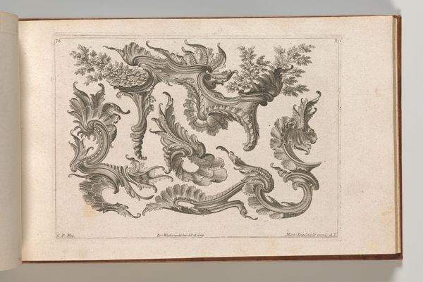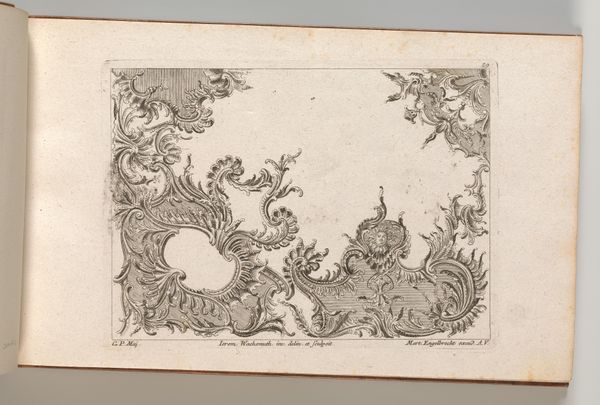 Editor: This is plate two from Johann Sebastian Müller's *Suggestions for the Decoration of a Door and Window Frame,* made between 1745 and 1755. The etching offers these incredibly ornate, baroque-style designs, and it strikes me how theatrical they appear. What social function did these designs play back then? Curator: It's less about high drama and more about reflecting the social and political aspirations of the patrons. The baroque style, with its emphasis on opulence and grandeur, served as a visual language to communicate power and status. Who do you think these images are intended to inspire? Editor: Well, the obvious answer seems like the aristocracy or the wealthy merchant class... anyone who could afford such elaborate ornamentation. Is it simply a question of wealth, or were there other layers to its meaning? Curator: Absolutely, it’s not simply wealth, it’s about projecting an image. Think of these designs not just as decoration, but as tools for shaping perception. Aristocrats and wealthy merchants used these elaborate architectural elements to project an image of sophistication and divine right. And consider who had access to images like this one - they were meant for the consumption of those in power. Do you think that understanding changes how we interpret the style now? Editor: It certainly adds a new dimension! Seeing it as a conscious construction of power makes it more than just aesthetic. Knowing who could afford it, who was meant to admire it, really impacts my understanding of the social role of this imagery. It shows that what we often regard as mere ornamentation carries deeper socio-political implications. Curator: Exactly. And perhaps looking at how these images are displayed today, in museum settings, we can reflect on how our own institutions play a role in continuing to shape these narratives. Editor: That's a really valuable point. It's all interconnected!