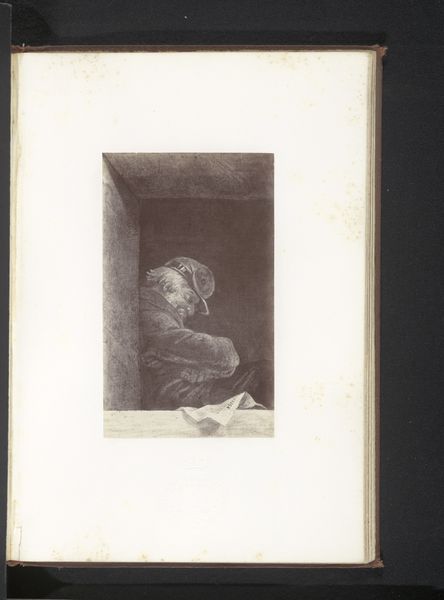 Editor: So this is a photographic reproduction of Antoine Wiertz's *Quasimodo*, made sometime before 1868. It’s striking; Quasimodo looks much more thoughtful here than I’ve ever imagined him. The keys add an element of mystery. What symbolic weight do you think they carry? Curator: The keys are potent. Keys have long signified authority, access, and knowledge, but also secrets and imprisonment. Consider the cultural memory attached to keys; in religious iconography, keys are prominently associated with Saint Peter, keeper of the gates of heaven. Wiertz positions Quasimodo with these very symbols that denote authority but also suggest his role as the bellringer confined within Notre Dame. Editor: That's a great point. So the keys are double-edged, representing both power and Quasimodo's captivity. Curator: Precisely. And notice the way Wiertz frames Quasimodo, the theatrical lighting emphasizing the character’s internal struggle, drawing from Romanticism. This adds to the cultural trope of the ‘outsider’ with hidden depths. How does this impact the viewer's understanding of the figure? Editor: I suppose it pulls us into Quasimodo's emotional world. We expect a monster, but instead, we are presented with a man burdened by thought. It’s interesting that Fierlants chose to reproduce *this* particular artwork of Quasimodo. Curator: Indeed, Fierlants’ reproduction underscores how deeply Victor Hugo’s character resonated and continued to inspire. He uses a modern medium to explore old themes. The image lives on through symbolism. Editor: It's fascinating to consider how photography extends the life and interpretations of the figure of Quasimodo, allowing the symbols within the frame to speak to new generations. Curator: Absolutely. A powerful convergence of Romantic ideals and photographic possibilities, perpetually reshaped in our collective imagination.