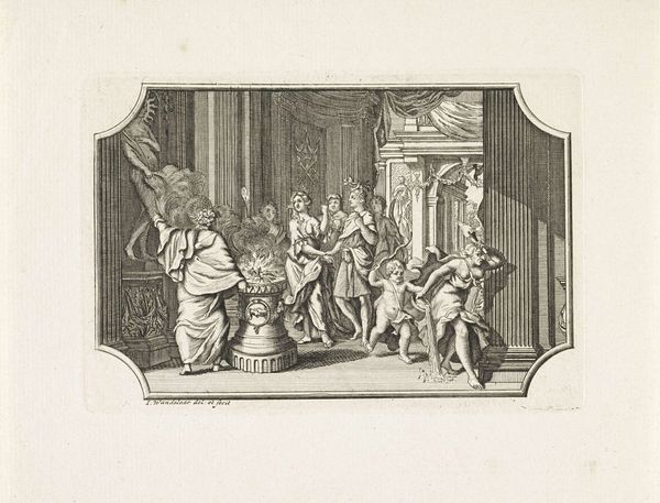 Editor: So, this is "Publius Horatius vrijgesproken" from 1793 by Ludwig Gottlieb Portman, currently at the Rijksmuseum. The level of detail achieved in what appears to be pencil on paper is really striking; it looks like an engraving. What do you see in terms of the overall composition? Curator: Let's observe closely how the artist directs our gaze. Note the deliberate placement of the figures and the architectural backdrop; all create a balanced but slightly asymmetrical composition. The artist utilizes the light and shadow to create a dynamic visual hierarchy, emphasizing the key players and narrative elements. Editor: It’s interesting that you point out the asymmetry. It creates tension, but is that intentional? Curator: Indeed. Focus on the contrast. Observe the strong vertical lines of the columns juxtaposed with the horizontal plane of the platform where Horatius kneels. It establishes a dialogue between stability and supplication. Ask yourself, what is the impact of rendering it in grayscale and light pencil? Editor: Good point. It brings an interesting timelessness to this classical subject. It feels contemporary despite the period clothing and setting. What would you say you learned from it today? Curator: I am drawn to how formal artistic decisions around visual organization contribute so decisively to an engraving’s effectiveness in communicating its story. It gives an opportunity to analyze its visual impact. Editor: Definitely! It gives new appreciation for all that precision. Thanks so much for shedding some light on it.