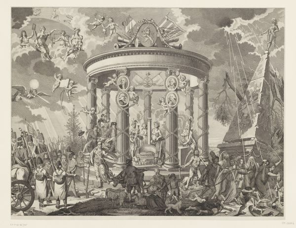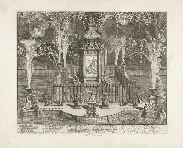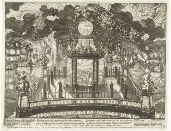 This print by Jan (II) Smit depicts fireworks in celebration of the Treaty of Nystad in 1721. Here, amidst the bursts of light and smoke, we see symbols of power and peace intertwined. The most prominent motif is "PAX," Latin for peace, inscribed beneath a crown. This symbol hearkens back to ancient Roman iconography, where Pax was a goddess often depicted with an olive branch, embodying the hope for tranquility and prosperity. In contrast, the fireworks themselves, though celebratory, are fleeting, ephemeral. We see crowns, symbols of earthly power, juxtaposed with deities from antiquity, reminding us of the cyclical nature of history. Though empires rise and fall, the desire for peace endures, etched in our collective memory. Such symbols possess a potent, almost subconscious appeal. They are reborn across centuries, adapted by new cultures, yet still resonating with the human spirit.