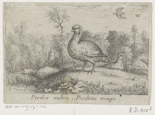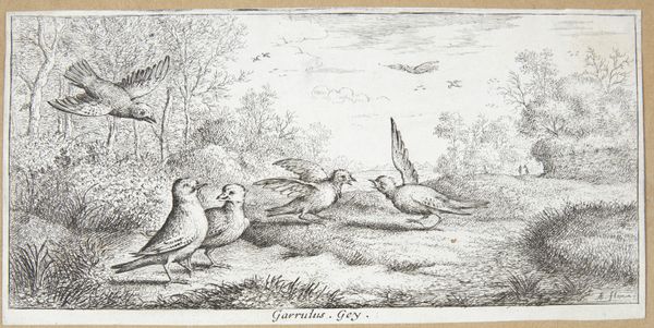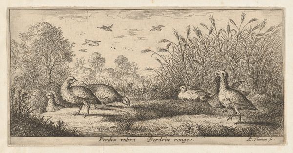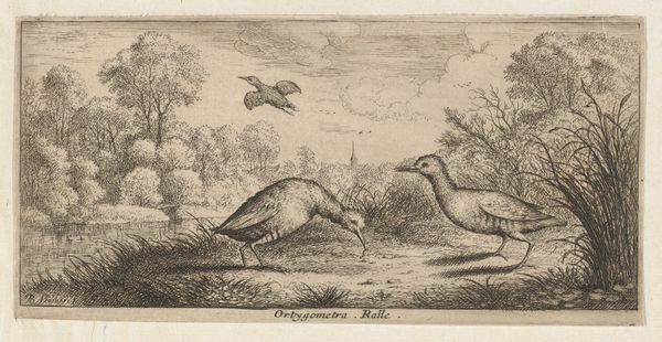 Curator: I'm drawn to the sheer simplicity of this print; it's all delicate lines and muted tones. Is it just me, or does this evoke a feeling of quiet observation, almost like peeking into a secret world? Editor: Indeed. What we're looking at here is Albert Flamen's "Vandhønen (Ortygometra)," likely created sometime between 1620 and 1669. It's an etching, which is a type of print, and what captivates me is how such a seemingly straightforward image reflects complex colonial and environmental histories. Curator: Colonial histories, really? I mean, it's birds... I thought this would just be Baroque landscape art. Editor: Absolutely. Landscape art, even those portraying birds, doesn't exist in a vacuum. Think about who had the leisure to observe and depict nature. What does it mean to classify, name, and represent a species—particularly through a European lens? We see here this impulse to categorize the world in terms of centers and margins, and those activities are embedded in this etching. The "natural" world gets packaged up neatly through artistic practices and gets circulated amongst elite audiences. Curator: I can appreciate that. Looking closer, it is about classification—almost cold, despite the organic subject matter. The detail on the birds, the way they're presented so meticulously... there's a taxonomic air about it. Although, there is something so satisfying in that kind of precision; a desire to order and define things—very human. How did the artist make something so delicate but also somewhat cold? Editor: Precisely. The etching technique lends itself to fine lines, which heightens the sense of realism. At the same time, think about what the birds, especially, symbolized in different cultures. This species migrates and connects lands through those patterns. And with migrations you get discussions about borders, territory, displacement... These creatures become very charged and relevant figures when considering questions about land and belonging. Curator: I love that perspective; it makes me think of these little birds carrying unspoken histories with them, across oceans. So much weight packed into those little avian frames! Looking again at the details, I admire how, with such minimal tools, Albert Flamen achieves the look of a full ecosystem. The details surrounding the wildlife show us the artist did observe a good deal. Editor: The interplay between art, science, and social context is often much more profound than we initially recognize, isn’t it? Vandhønen really gives a new insight on our perspective about ecology.
