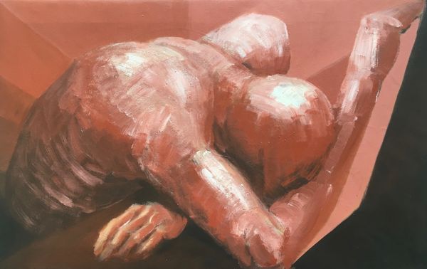 Editor: This is Jenny Saville’s "Suspension," created in 2003, an oil painting that just hits you with its visceral figuration. The bold strokes and fleshy tones are pretty overwhelming, even confrontational. What can you tell me about this work? Curator: Look at the sheer materiality of the paint. Saville's application is incredibly physical, almost sculptural. We see how the labor is evident in each brushstroke, building the form but also challenging traditional, idealized representations of the nude. How does this materiality affect your understanding of the subject, the female form? Editor: I guess it pushes back against any sort of idealized, passively consumed image. The paint itself seems to have a life of its own, separate from representing the figure. It's less about looking and more about *encountering* something… substantial. Curator: Precisely. Consider how the raw pigment, the heavy application of oil paint, serves to emphasize the corporeal nature of the body. This links directly to questions about labor, production, and the act of seeing. Do you see any challenge of the conventions between 'high art' and the materiality of craft, labour? Editor: I see that now. The emphasis isn’t just on *what* is represented, but *how* it’s made, how it takes form through physical action. The sheer physicality is almost…vulgar, refusing any sort of refinement. Curator: Yes, and how that “vulgarity,” if we can call it that, reclaims agency. It foregrounds the body not as a polished commodity but as something actively, even laboriously, constructed through paint. And notice how those drips aren’t just accidents, but extensions of that process, further blurring boundaries between figure and ground. Editor: It’s fascinating how Saville makes you think about painting not just as representation, but as a process rooted in materials and labor. Thanks, I will keep that in mind when thinking about her paintings. Curator: Indeed. Reflecting on how artists use materiality reveals power structures within art and its reception. A closer inspection of materials reveals their role in actively challenging and redefining conventional perspectives.